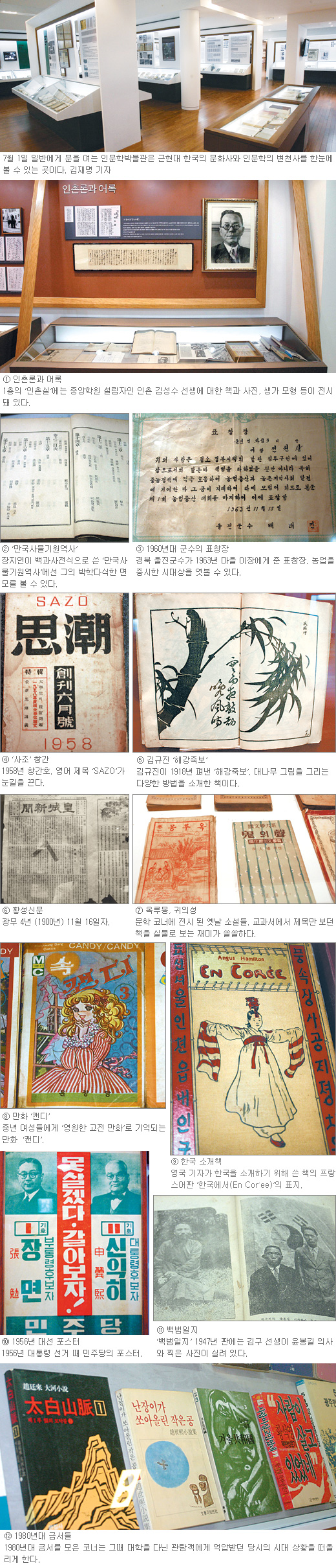 7¿ù 1ÀÏ ÀϹÝÀο¡°Ô ¹®À» ¿©´Â ±¹³» ù Àι®Çйڹ°°ü¿¡ Àü½ÃµÈ °ÍµéÀÌ´Ù. ¼¿ï Á¾·Î±¸ °èµ¿ Áß¾Ó°í ±³³»¿¡ ¼³¸³µÈ Àι®Çйڹ°°üÀº ±ÙÇö´ë±â Çѱ¹ÀÇ ¹®È»ç¿Í Àι®ÇÐÀÇ º¯Ãµ °úÁ¤À» ÇÑ´«¿¡ º¼ ¼ö ÀÖ´Â °÷. º¸¿©ÁÖ´Â µ¥ ±×Ä¡Áö ¾Ê°í ÇØ´ç Àü½Ãǰ¿¡ ³ì¾Æ ÀÖ´Â Àι®Á¤½Å¿¡ ´ëÇØ °ü¶÷°´¿¡°Ô Áú¹®À» ´øÁö´Â Çü½ÄÀ¸·Î °¢ Äڳʰ¡ ±¸¼ºµÅ ÀÖ´Ù. ÇÏÁö¸¸ Àü½ÃǰÀÌ 3000¿© Á¡¿¡ À̸£´Ù º¸´Ï ²Ä²ÄÈ÷ µé¿©´Ùº¸Áö ¾ÊÀ¸¸é ÀÇ¹Ì ÀÖ´Â Àü½ÃǰÀ» ±×³É Áö³ªÄ¥ ¼öµµ ÀÖ´Ù. ³õÄ¡Áö ¸»°í ºÁ¾ß ÇÒ Àü½ÃǰÀº Ãþº°·Î ¾î¶² °ÍÀÌ ÀÖÀ»±î.